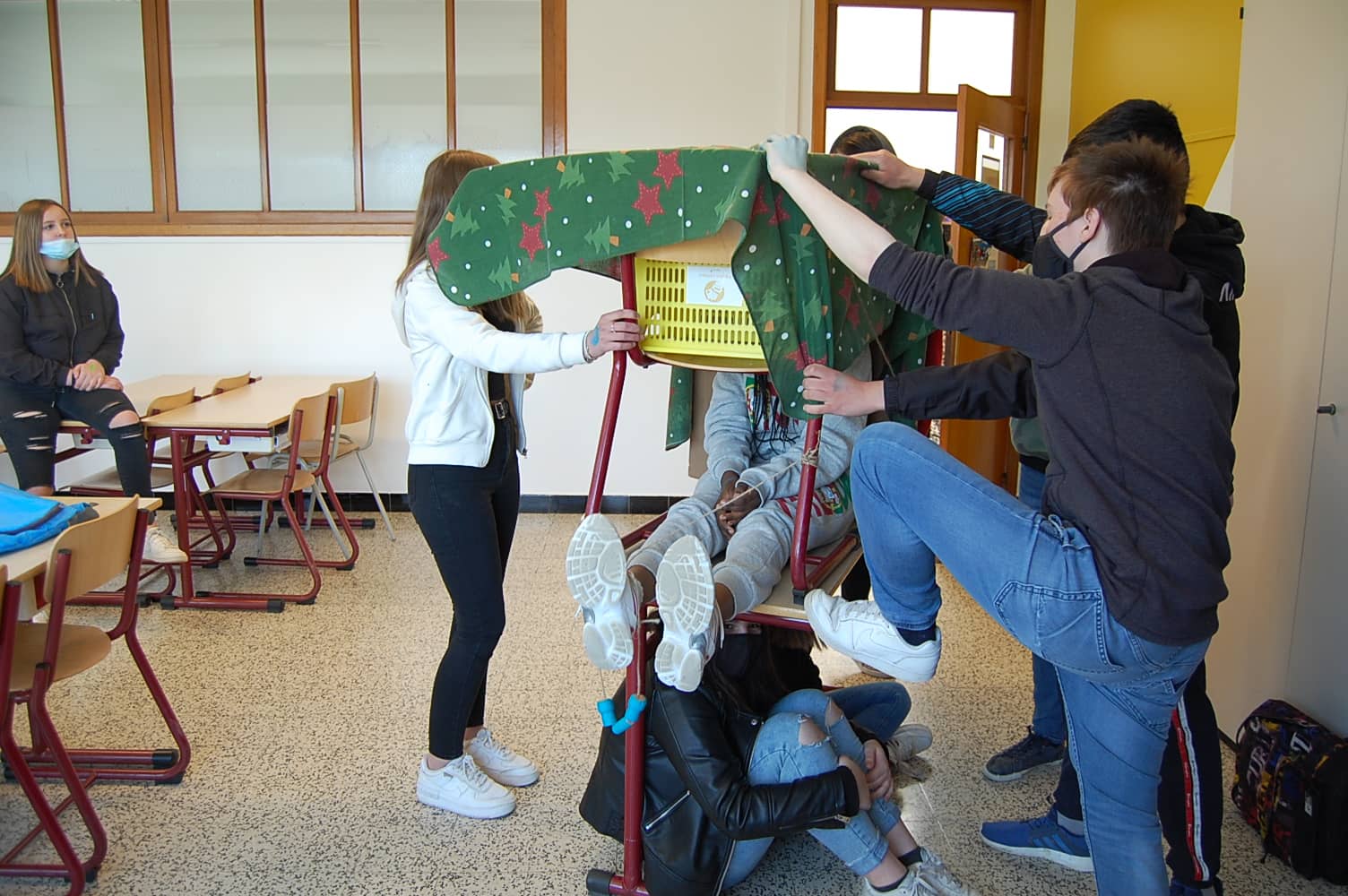 Durant la semaine de reprise, le 1er degré a eu l’occasion de se frotter aux fameuses épreuves de Cardijn Lanta. Poteaux, radeau, abri, poids et orientation, ne sont pas venus à bout de nos champions.