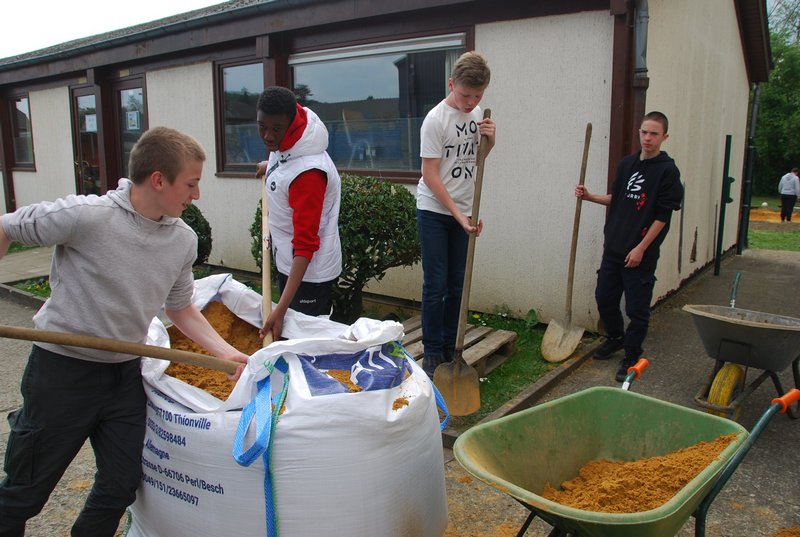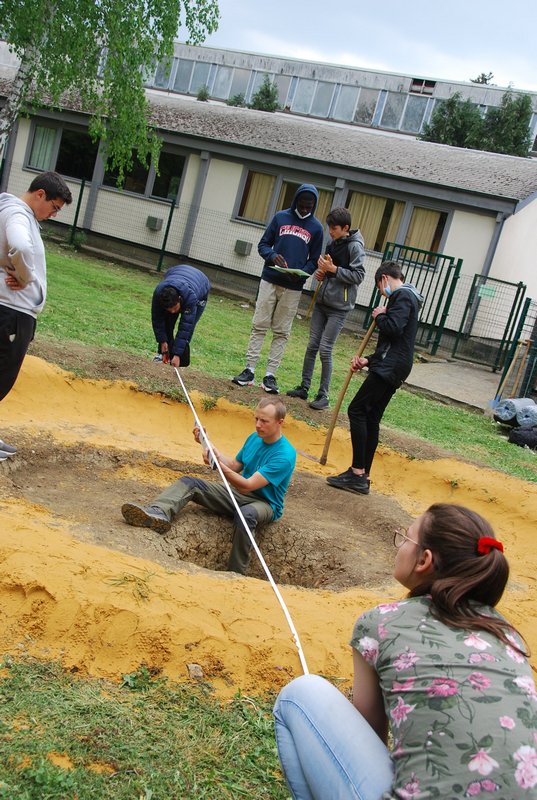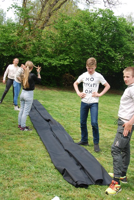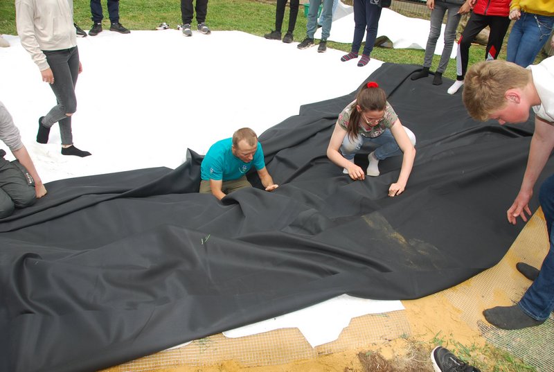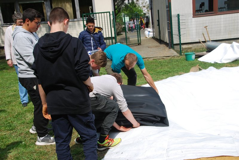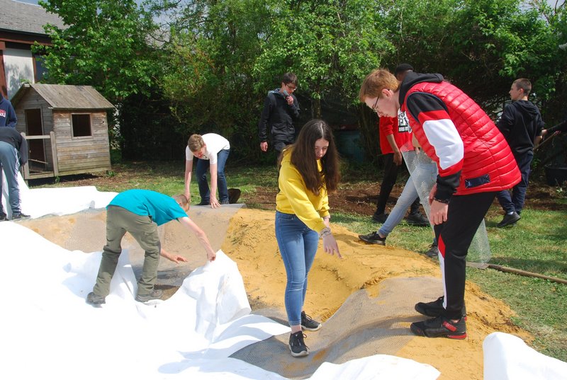 Avec l’aide notre guide, M. Dugaillez, nous avons stabilisé le fond du futur plan d’eau avec du sable. Ensuite, sont venus se superposer, un treillis anti-rongeurs, un géotextile et enfin la bâche. Pendant que certains s’adonnent avec énergie à ces tâches, d’autres élèves peaufinent les différents abris, évaluent le volume d’eau à prévoir, effectuent le reportage de cet évènement. Beaucoup d’enthousiasme – très apprécié – autour de tout ce programme. Bravo à nos élèves de 2ème Option Sciences – Travaux Nature !